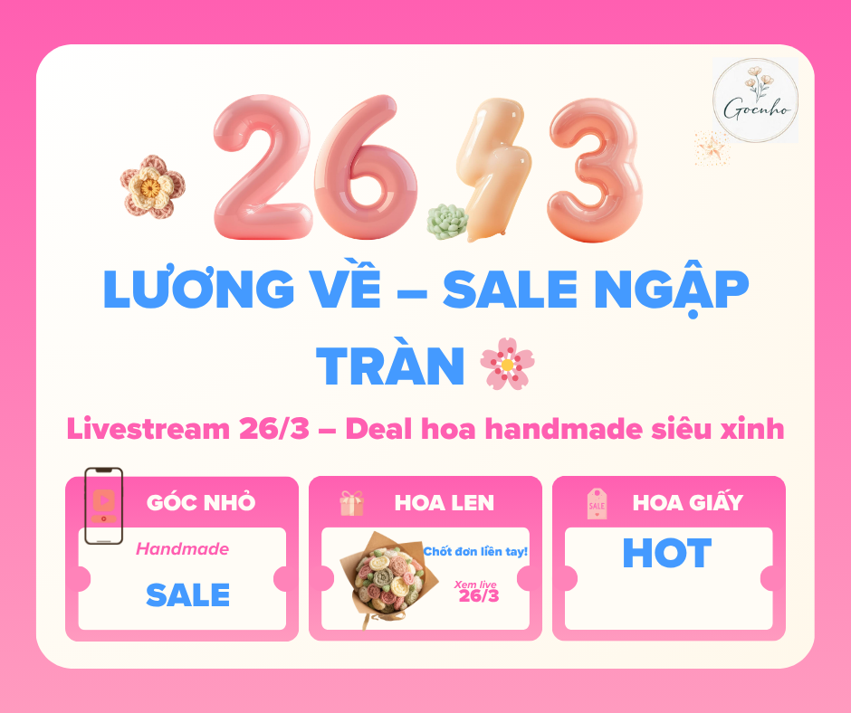 Tham gia livestream 26/3 tại Góc Nhỏ để săn hoa handmade siêu xinh với giá ưu đãi. Deal độc quyền, số lượng có hạn, chốt đơn nhanh tay!